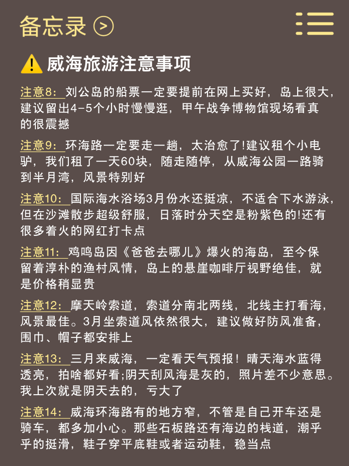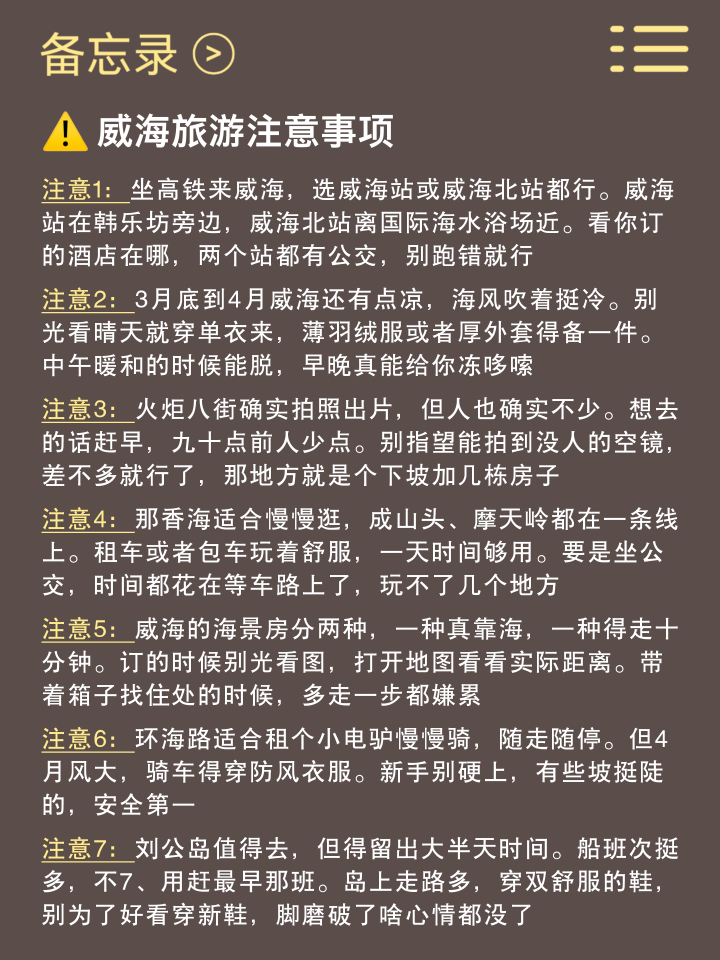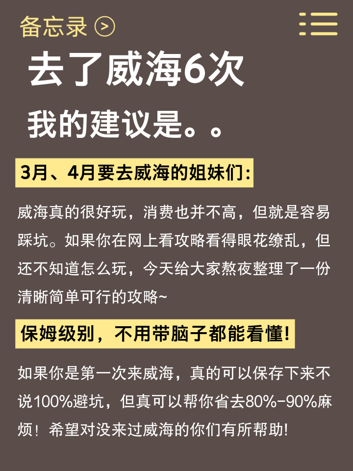 当作去过6次威海的半个“土产货东谈主”亲测看了几篇帖子,发现xhs上的许多攻略皆是逾期的!!不念念环球再被误导,只念念说点威海旅游这块掏心掏肺的大真话😢😢。。。。但愿环球不要花了钱还玩得不欢腾~